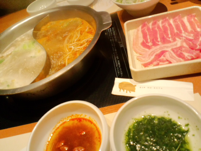 」。 先日、友人に近頃人気の或ると云う “豚しゃぶ” のお店に連れて行って頂きました。 流石に人気店、平日の夜だと云うのに満席・・・そして数十分の wait の後テーブルへ。 ここのお鍋は2色鍋で、おだしを7種から選びます。 今回は 『美肌とんこつ』 と 『四川薬膳』 をchoice、野菜も定番の野菜の他に、細切野菜と云うのがあり、サッと鍋でしんなりさせたところでお肉に巻いて頂きます。 最後のデザートも7品から選ぶことができ私はメープルシフォン