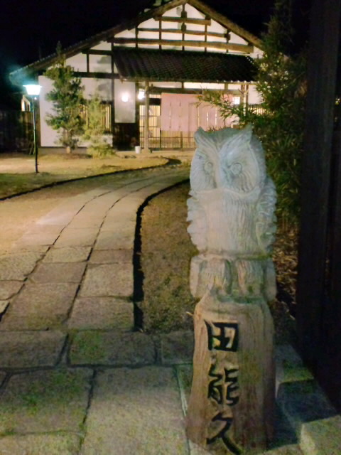 は『田能久』。湯郷温泉のゆ~らぎ橋の袂(たもと)にある“田能久”と云う十割蕎麦と地鶏のお店を訪れました。店内は昔ながらの民家の趣、天井はなく梁が見えていて席には団炉裏。電蓄でSP盤のJazzを聴きながら緩やかな素敵な時間を過ごしました