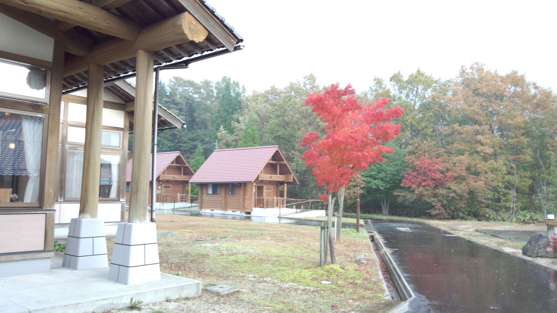 ヒノキをふんだんに使用して作られた家屋。ロビーへと続く通路の脇の紅葉も真っ紅な装いでした。