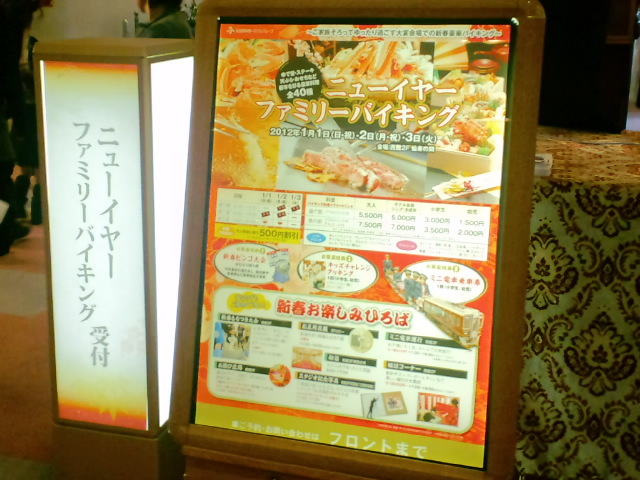 は“新年会”。一発目は大団円(終わりではなく始まりですが)と云う事で家族の新年会の話題です。私の家では新年のお休みに近場のホテルのバイキングで新年会をします。そして今年は千里阪急ホテルへ。バイキングと云っても若い頃のような食べ方はできませんが余興もあり“お正月やなぁ”と周りの雰囲気を楽しんでの食事会になっています。しかも今回はビンゴ大会で当ホテルのさくらラウンジの“ペアケーキセット券”も当たり…今年は(もしかしたら)ラッキーイヤー