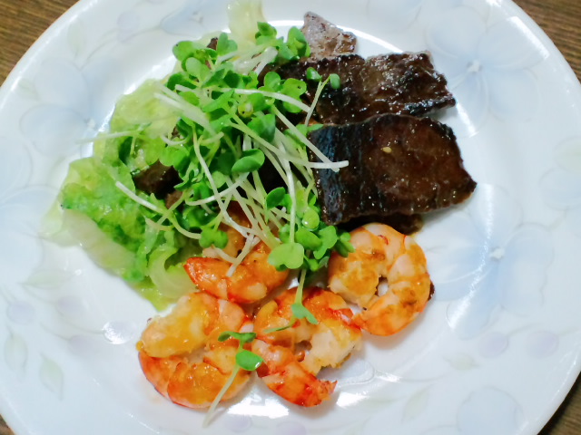 も牛肉、海老も一緒にグリルしました。静かな食卓もいいですね