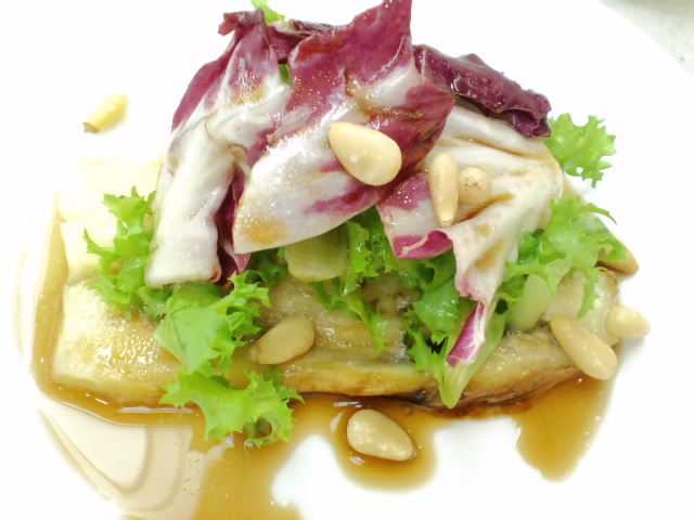 の定番焼きナス(丸ごと焼いて皮をむくだけ)は削りかつおと生姜を添えて醤油をかけて頂くスタイルなのですが今回、習ったのはサラダ風焼きナスの上にエンダイブ、トレビスでおめかし