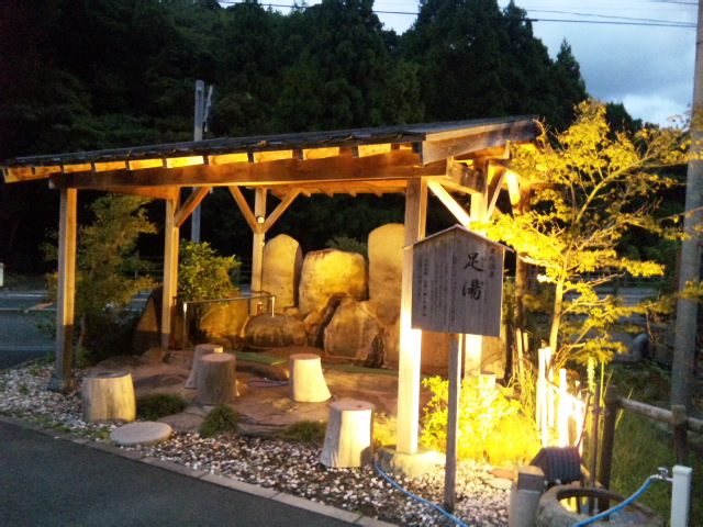 は「鹿野温泉」→ 湯あみに訪れた時はまだ夕暮れだったのです がゆっくり露天風呂に入っていたので、帰る頃には“足湯”もライトアップです。