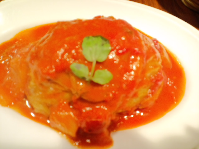 左) 完熟トマトをまるごと、その下にはツナマヨソースが絡まったサラダ。 ナイフで切って(私はくし切り、今回一緒に行った友人はさいの目切り)、そのソースに絡めて頂きます。 次にメイン。 いつもなら王道のハンバーグにするのですが今回は "ロールキャベツ”(